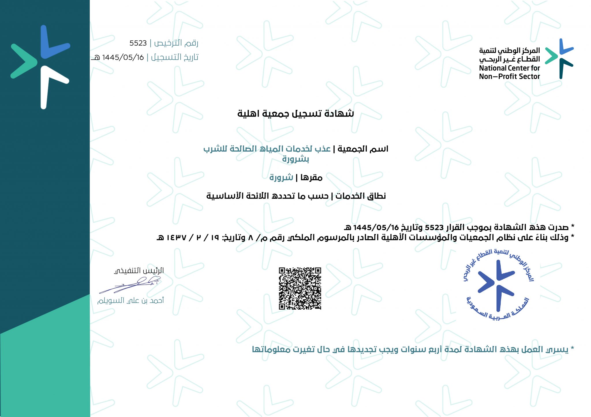 جمعية خيرية أُسست في مدينة شرورة، ومسجلة في المركز الوطني لتنمية القطاع غير الربحي برقم (5523) بتاريخ 16/05/1445هـ الموافق 30/11/2023م، لتشمل خدماتها محافظة شرورة والمراكز التابعة لها.